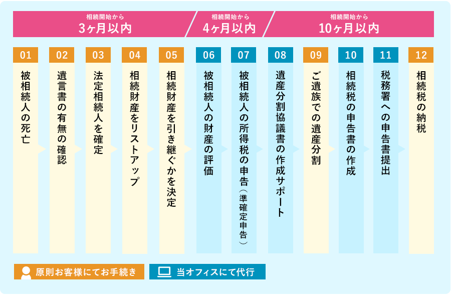 相続が発生し、「まず、なにから手を付けて良いかわからない」「全体のイメージがわかない」とお困りの方も多いかと思います。当ページでは、まずはお客様が気になる3つのポイントをまとめました。はじめにこちらをお読みいただくと、全体のイメージをつかんでいただけるかと思います。